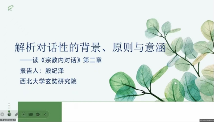 殷纪泽同学汇报的第二部分题为“文本诠释:对话性的背景、原则与理论”。这一部分首先介绍了对话性理论提出的背景和立场。宗教对话有三种立场,一元论、多元论与不二论。不二论由潘尼卡在多元论的基础上提出并主张,认为宇宙实体与宗教主体之间存在不二关系,因此在对话中不预设唯一实体。宗教对话有三个哲学范畴,宇宙、神、人的相互关系。对话性理论的提出基于宇宙-神-人三元一体的哲学模式,这种哲学模式的提出和潘尼卡对于印度教梵我一如的理解存在关联。接着是对话性和辩证性的比较,包括对话性与辩证性的辨析、对话的意向性。对话性原则是对话双方在保持自身立场和思想的基础上进行自我意见的抒发,辩证性原则是对话双方运用辩证法来进行意见交流、旨在得到最全面客观的理论。在潘尼卡看来,对话性注重交流主体的主观经验,辩证性注重客观实体的真实性。对话的意向性是对话双方在基于个体对宗教经验的体验和宗教理论的理解的基础上进行带有主观性的交流。潘尼卡认为,对话的意向性是对话双方本来具有的一种要素,在对话性原则的指导下主观意向应当被合理地抒发。潘尼卡对主观性的尊重,在一些学者看来与海德格尔《存在与时间》当中的一些哲学构建相关。海德格尔认为存在的主体在整个时间框架中占有一定位置,基于这个位置产生的主观性十分重要,潘尼卡即是继承了海德格尔的这种对主观性的尊重。最后是对话性理论的哲学意涵,包括对话性隐含的我在与他在、内含的视角与源泉。“我在”包含对话中作为主观思考和感受的抒发者的“主格”之我和作为他方思考和感受的接纳者的“宾格”之我,“他在”则是对话时隐含的他方立场。在对话性原则指导下,对话双方并不受制于一个高于一切的神或逻各斯作为客观真理的仲裁者,而是能够同时接纳这两种身份,并在两种身份中进行有机的取舍,保留对他方立场所带有真理性的尊重和容纳。视角是对话时思考交谈内容的立场和背景,源泉是对话时真理的来源,潘尼卡将二者作为一体两面的对话要素,在对话性原则的指导下,客观的真理来源与主观的意见表达是交融一体的。