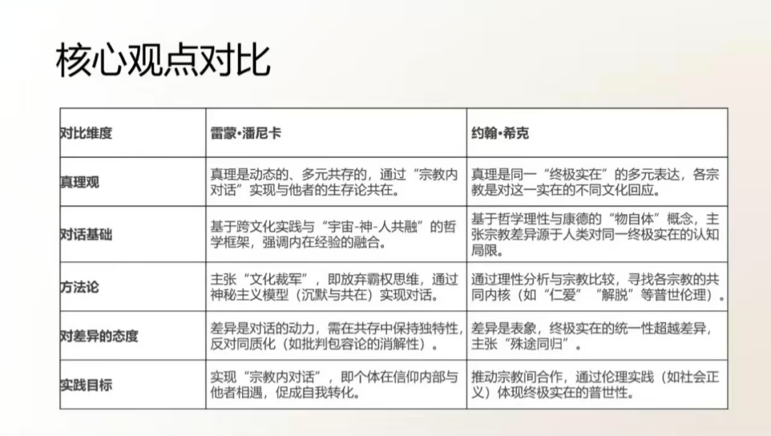 接着,李佳龙同学将潘尼卡的理论和约翰·希克的多元论从真理观、对话基础、方法论、对差异的态度和实践目标五个维度进行了对比。潘尼卡和约翰·希克二者的理论都反对宗教排他性,承认宗教多样性的价值,主张通过对话促进和平。但是,在真理本质、对话路径、对差异的处理等问题上,二者的观点存在差异。在真理本质问题上,希克的真理是“一元多面”,终极实在为不可知的本体;潘尼卡的真理是“多元互动”,通过对话动态生成。在对话路径上,希克依赖哲学理性与普世伦理,潘尼卡依赖跨文化体验与神秘主义实践。在对差异的处理上,希克将差异归因为文化滤镜,而试图消解差异;潘尼卡将差异视为共在的前提,而拥抱差异。