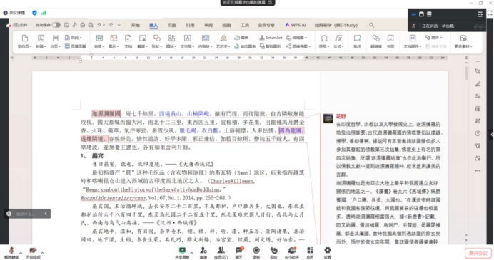 随后,殷纪泽同学向大家分享了对迦湿弥罗国后半部分文本的梳理和解读。参照季羡林先生在《大唐西域记校注》中所做的分判,殷纪泽同学将迦湿弥罗国后半部分文本分为五个各自独立又互相关联的部分:第一部分是雪山下王推翻讫利多种的统治从而重新振兴佛教这一历史事件;第二部分到第五部分介绍了迦湿弥罗国内几个最为重要的佛教遗迹的来历和发展,其中包括佛牙伽蓝、众贤论师遗迹、索建地罗论师遗迹、象食罗汉遗迹、圆满论师遗迹以及觉取论师遗迹。