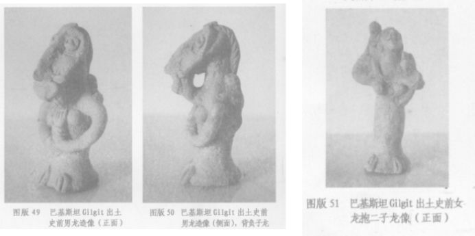 关于迦湿弥罗国的龙,华也靓展示了一组吉尔吉特(Gilgit)出土的龙像的照片。吉尔吉特位在克什米尔地区,即古代之迦湿弥罗国,即是受末田地化而献地立伽蓝的龙王所在,此地亦出不少早期大乘梵文经典。此两件陶土造像由造型、材质及手法来看,应是同一组造像,且年代亦为史前。其中一件为男龙造型,高10.5厘米,其头部造型留有胡子及辫子。具两手、两足,无尾巴。背上背负一条小龙,亦具四肢而无尾。另一件为女龙造像,高13厘米,具女性面部及凸出的乳房,两手各抱一小龙,一在左胁下,一在右肩上。小龙亦具四肢而无尾。