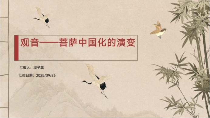 在第六章本土图像与观音的本土化中,李瑶同学称本章从艺术史角度,探讨了两种在中国创造并流行的观音图像——水月观音和白衣观音——如何参与并体现了观音信仰的本土化与女性化进程。这些图像缺乏直接的印度经典依据,其灵感源于中国本土的文学想象、艺术创作和宗教实践。“水月观音”以其文人化的诗意美学体现了禅与净土的融合;“白衣观音”则与民间祈求嗣息(求子)的信仰结合,逐渐强化了其女性慈母的形象。这些图像不仅是艺术创作,更是信仰和教义的视觉表达,深刻影响了中国民众对观音的认知。李瑶同学提出观音被中国文化所接受和改造,具有本土化和女性化的特征。并介绍了观音中国化的三重路径,一是感应故事,感应故事中描述了神异僧的灵验,在文本层面提供了叙事的合法性和传播的活力。这些故事深深植根于中国的“天人感应”思想,特别强调了感应故事与观音图像的密切关系,许多故事中观音显灵的形象源于当事人当时所能见到的观音造像,新的灵验故事又反过来刺激和催生了新的观音像的创作。二是神异僧传说,神异僧的传说促进了其圣像的创作与崇拜,在人物层面提供了身份的具象性和地域的归属感。核心功能是提供具象的崇拜对象,比如,宝志(志公禅师)是南北朝时期的神异僧,以其预言和神迹著称,被后世认定为观音应化身。僧伽大师是唐代僧人,在泗州(今江苏境内)建立道场,被尊为“泗州大圣”。他因其巨大的感召力和神异能力,死后被官方和民间共同认可为观音化身。他的存在,使观音信仰与中国特定地域(泗州)紧密结合起来。三是本土图像,新的观音图像又成为新的感应故事的灵感来源,在视觉层面提供了最终的美学定型和性别的转换。核心功能是视觉定型。这两种图像是纯粹的中国创造,代表了中国人对观音的独特理解。水月观音出现于唐代,呈现一位悠闲、沉思的菩萨形象,背景是竹林、流水和明月。白衣观音通常为女性形象,身着白衣,恬静慈祥。其信仰核心常与“送子”相联系。白衣观音彻底展现了观音作为生育和保育女神的职能,是其女性化和民俗化的关键一步。