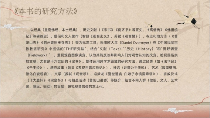 2025年9月23日晚7点,西北大学玄奘研究院第120期读书会在线上举行。本次读书会汇报的内容为于君方《观音—菩萨中国化的演变》一至六章,由历史学院硕士生周子菲和区域国别学院硕士生李瑶领读,中国社会科学院世界宗教研究所夏德美研究员评议。西北大学历史学院李永斌副教授、区域国别学院谢志斌副教授、陕西省社科院黄凯老师,以及西北大学历史学院、中东研究所、哲学学院、文学院及北京大学、北京师范大学、四川大学、武汉大学等高校和单位60余名师生在线上一同参与了此次读书会。