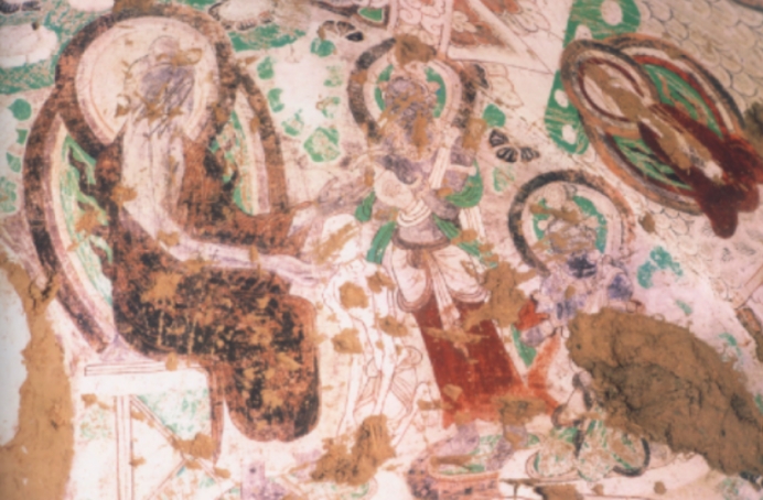 “佛洗病比丘”故事解释了壁画的三个细节。其一,故事高潮在于佛陀慈悲为怀,亲手为患病比丘清洗身体。佛陀一手接水,一手触摸比丘身体,完全符合文本描述。壁画中站立天人手持宝瓶倾倒之景,可以对应文本——帝释天提供了洗浴用的汤水。其二,尽管文本没有明确提及,不难做出推测:因为洗浴所需,比丘褪去了袈裟。这解释了壁画中受洗比丘躯体裸露的特殊状态。其三,如经文所述,此比丘“长病委顿,羸瘦垢秽”,壁画特意表现了其瘦骨嶙峋的身体特征。可参考:任平山.伯西哈石窟、克孜尔石窟佛传壁画“佛洗病比丘”释读[J].西域研究,2017,(01):87-90+149.