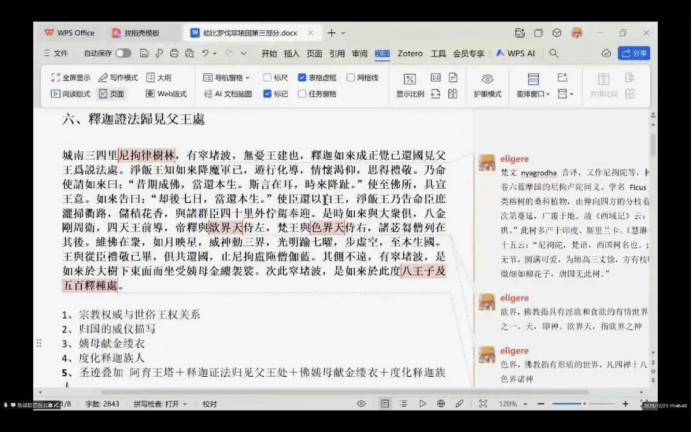 在“得眼林”故事部分,金铭洋同学提到,得眼林得名源于500盗贼被剜眼后受佛陀统治的传说,突显了慈悲救赎的主题。他还对读了《法显传》中对这一故事的记载:精舍西北四里有林,名曰得眼。本有五百盲人依精舍住此,佛为说法,尽还得眼。盲人欢喜,刺杖著地,头面作礼。杖遂生长大,世人重之,无敢伐者,遂成为林,是故以得眼为名。接着他梳理了“投杖成林”这一母题在不同典籍中的变体:从德眼林的佛教救赎故事,到大唐西域记中婆罗门丈量佛身的杖林典故,再到山海经里夸父“弃杖成林”的经典意象。