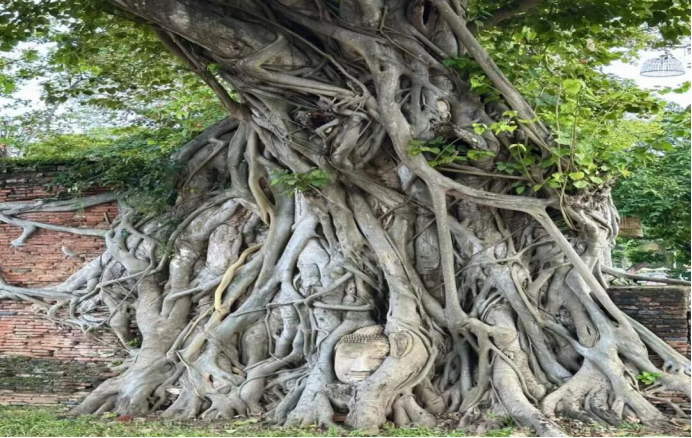 值得注意的是,陈祥珍还说到了尼拘律树的树皮还可用于洗牙,这在阿育吠陀的日常养生中扮演着重要角色。日常养生是一套旨在改善个人身心健康的阿育吠陀原则。洗牙应每日进行两次。用于洗牙的工具有arka、nyagrodha、khadir、karanja、arjuna等树皮,其味道辛辣、略带苦涩。陈祥珍同学还从现代植物分类学角度来分析,尼拘律树Nyagrodha与我国南方的榕树属于同属或近亲物种。她进一步分享“树抱佛”景观的发现:泰国大城府马哈泰寺的榕树包裹佛像奇观,以及中国乐至报国寺类似的榕树包裹佛像现象。值得注意的是,她特别提到川渝地区特有的佛教石刻被榕树包裹的独特景观,展现出跨文化植物崇拜的有趣对比。